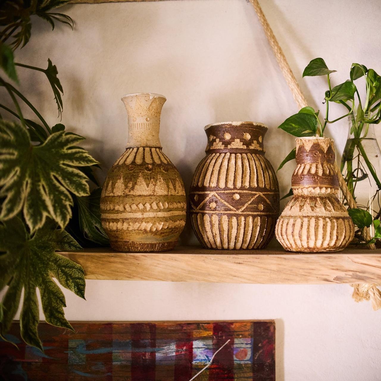 Jarrones y sahumadoras de arcilla local – Voz de la tierra Cada uno de estos jarrones ha sido pintado con arcillas recolectadas en la isla, teñidos por su historia, su memoria mineral, su pulso silente.
