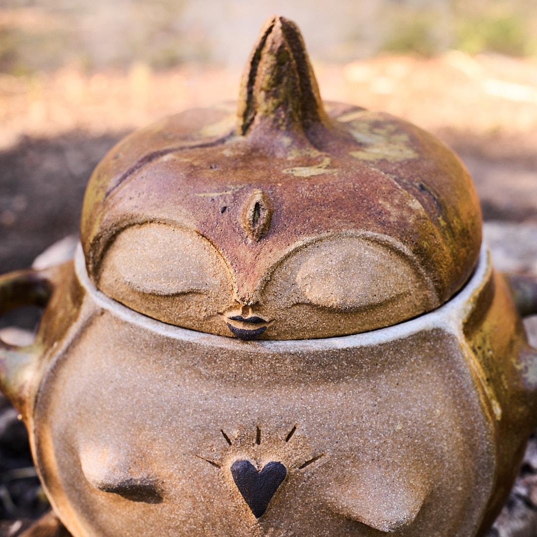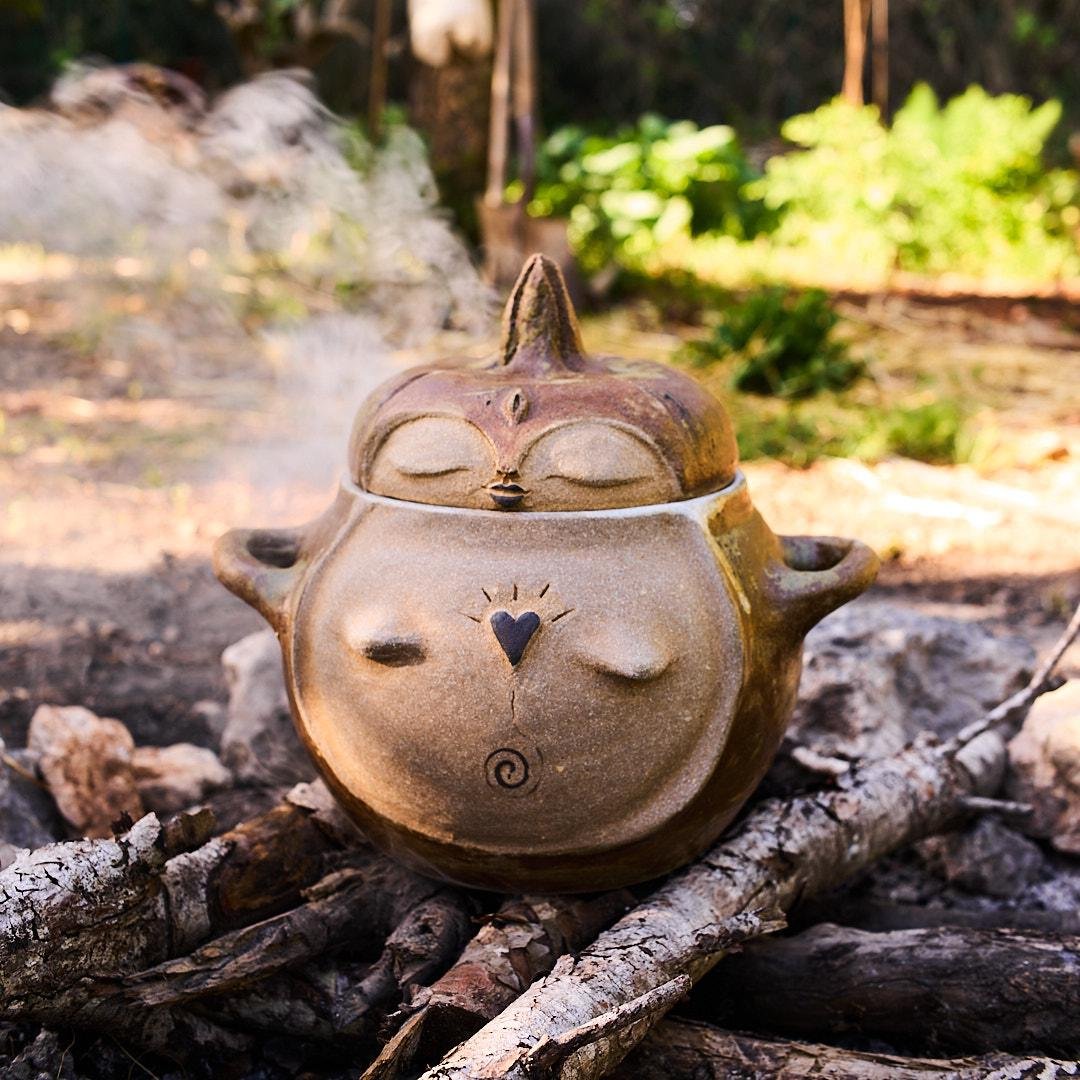 “Semilla de fuego” – Olla de cerámica pintada con arcilla local Esta olla nace como una semilla: contenedora de vida, transformadora por naturaleza. Pintada con arcill local guarda el calor de la tierra, fue pensada como un útero donde el alimento se cocina, se transforma, y nos transforma.